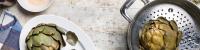 Lavez les artichauts en les trempant dans de l’eau froide pendant 5 minutes. Coupez les tiges. Remplissez la casserole aux trois quarts d’eau et portez à ébullition. Placez les artichauts dans le panier à vapeur et faites cuire pendant 30 minutes. Vérifiez la cuisson en tirant sur une feuille. Si elle se détache facilement, l’artichaut est cuit. Préparez la vinaigrette en mélangeant la moutarde et le vinaigre, puis en incorporant l’huile avec un fouet. Salez et poivrez à votre convenance. Servez les artichauts chauds avec la vinaigrette.