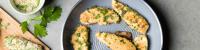 In a bowl, mix the breadcrumbs with the Parmesan, flat-leaved parsley andthyme. Season with salt and pepper. Cut the chicken fillets into strips measuring around 1cm thick. Break the eggs into a bowl and beat them.Turn the chicken strips in the egg mixture and then in the Parmesan mixture, making sure they are well coated. Place them next to each other in a dish. Heat the oil in a suitable frying pan and fry the chicken strips, in portions,until they are crisp on all sides.